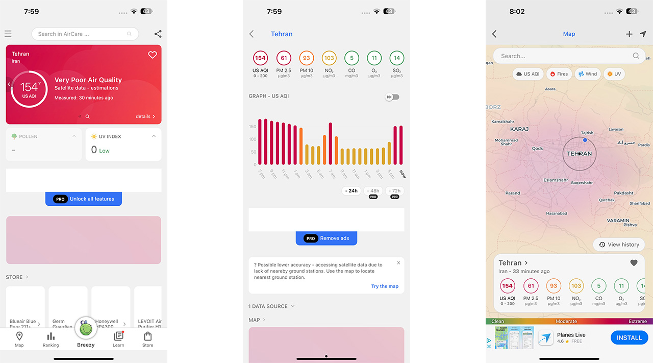 اپلیکیشن Air Care نیز یکی از گزینههای خوب برای بررسی میزان آلودگی هوا به حساب میآید؛ البته باید گفت که همانند بسیاری از اپلیکیشنهای امروزی، برای استفاده از تمامی قابلیتهای AirCare باید اشتراک نسخه حرفهای آن را تهیه کنید. این اپلیکیشن گزارش دقیقی از وضعیت آلودگی هوا در ساعات مختلف روز را ارائه داده و امکان مشاهده آمار روی نقشه نیز توسط آن وجود دارد.