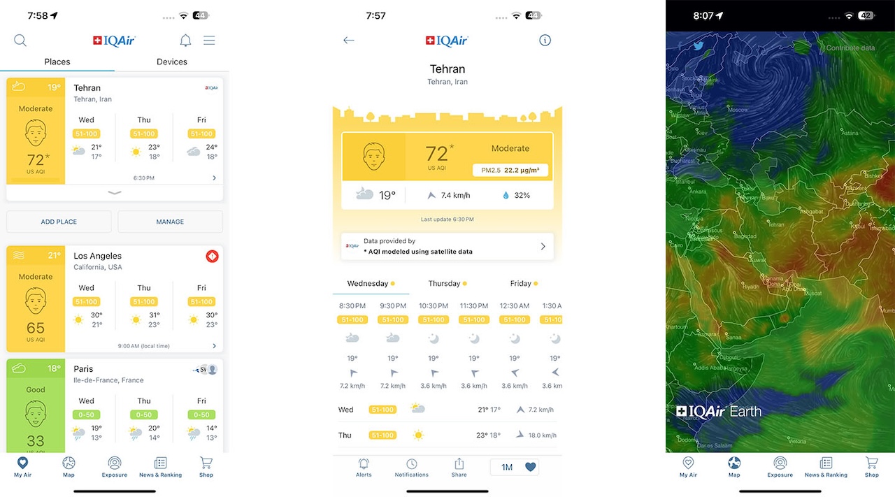 IQAir Air Visual که یکی از قدیمیترین اپلیکیشنها در این دسته است؛ عملکرد خوبی داشته و رابط کاربری آن نیز از گزینههای ایرانی جذابتر است. این اپلیکیشن در کنار اطلاعات مربوط به آلودگی هوا، گزارشات هواشناسی را ارائه میدهد و همچنین امکان ارسال اعلان در هنگام آلودگی شدید هوا را نیز دارد. یکی دیگر از قابلیتهای جالب IQAir Air Visual، امکان نمایش وضعیت آلودگی هوا در شهرهای مختلف جهان به صورت همزمان است.