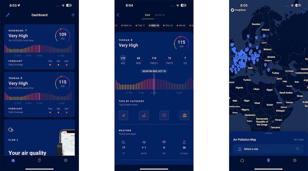 اپلیکیشن Plume Labs: Air Quality App بدون شک جذابترین رابط کاربری در بین این دسته از اپلیکیشنها را دارد. این اپلیکیشن امکان نمایش وضعیت آلودگی هوا به صورت روزانه یا ماهانه را ارائه داده و این اطلاعات را روی نقشه نیز به نمایش میگذارد. متاسفانه، امکان مشاهده وضعیت آلودگی هوای کشور ما روی نقشه این اپلیکیشن وجود ندارد؛ اما Plume Labs: Air Quality App همچنان بهترین گزینه برای افرادی است که به طراحی و ظاهر اپلیکیشن اهمیت فراوانی میدهند.