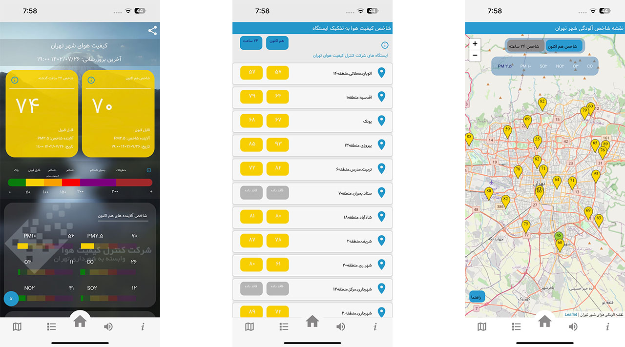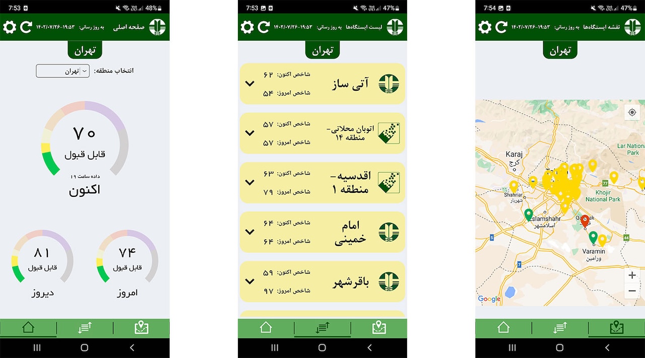 اپلیکیشن سامانه پایش کیفی هوای کشور که توسط سازمان محیط زیست توسعه یافته است؛ یکی از بهترین گزینهها برای چک کردن وضعیت آلودگی هوا در مناطق متفاوت ایران محسوب میشود. این اپلیکیشن با وجود رابط کاربری قدیمی و نه چندان جذاب خود، کاربردهای فراوانی داشته و امکان نمایش وضعیت آلودگی در شهرها و مناطق متفاوت روی نقشه را نیز دارد.